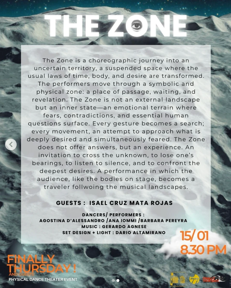 The performers move through a symbolic and physical zone: a place of passage, waiting, and revelation. The Zone is not an external landscape but an inner state-an emotional terrain where fears, contradictions, and essential human questions surface. Every gesture becomes a search; every movement, an attempt to approach what is deeply desired and simultaneously feared.